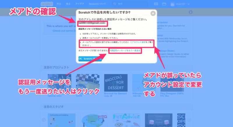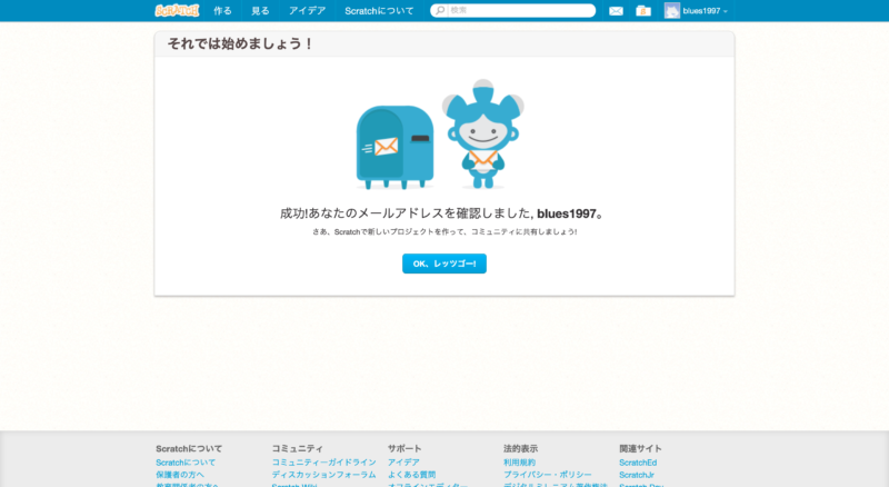 「電子メールアドレスの認証」をクリックすると、ScratchのWebサイトにリダイレクトされ、認証成功の表示がされます。