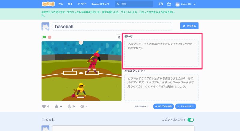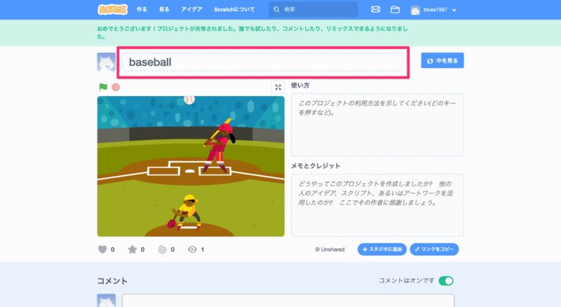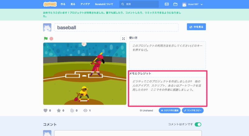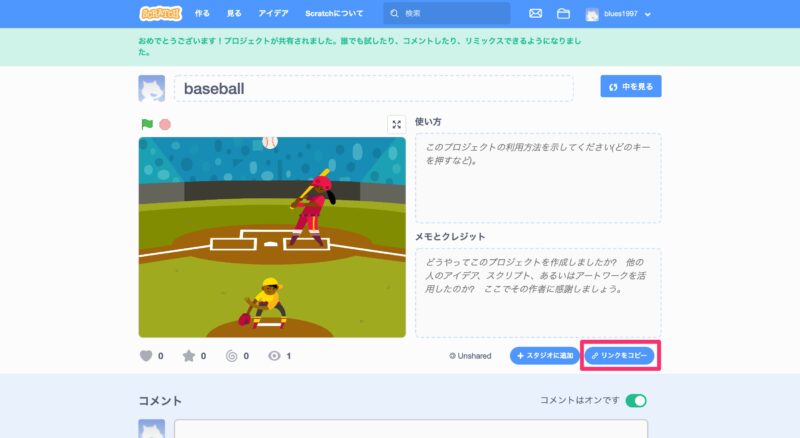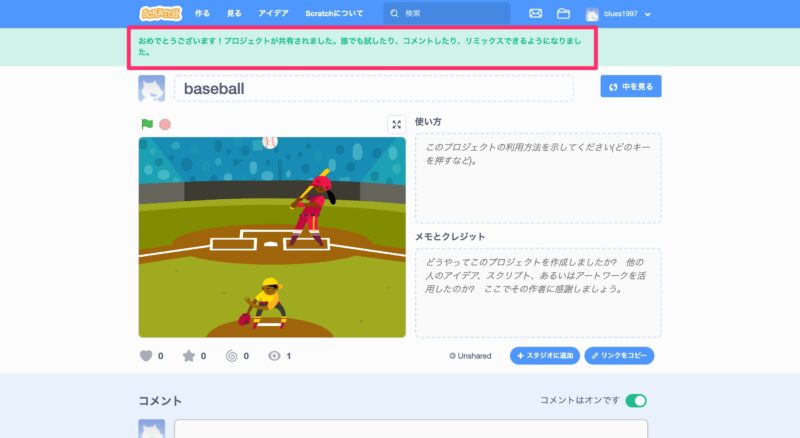 「おめでとうございます!プロジェクトが共有されました。誰でも試したり、コメントしたり、リミックスできるようになりました。」というメッセージが表示され、作品が共有されました。