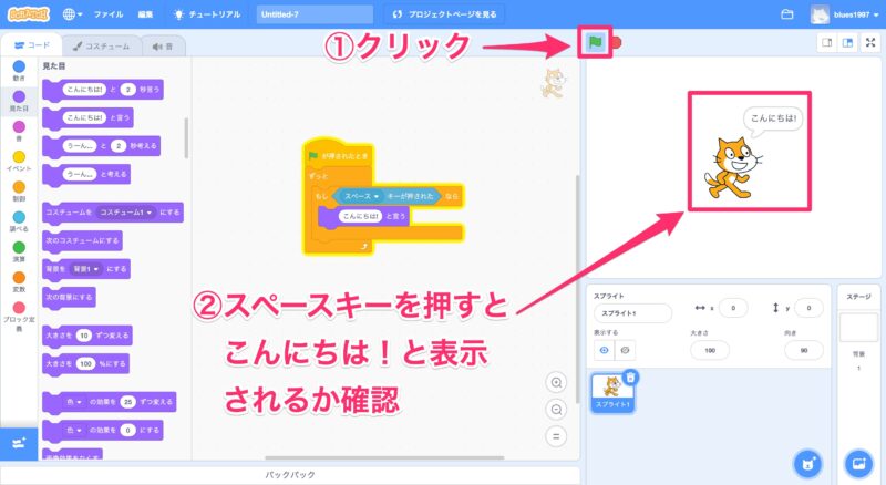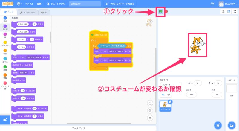 スペースキーを押した時に、スプライトキャットのコスチュームが変わるか確認してください。