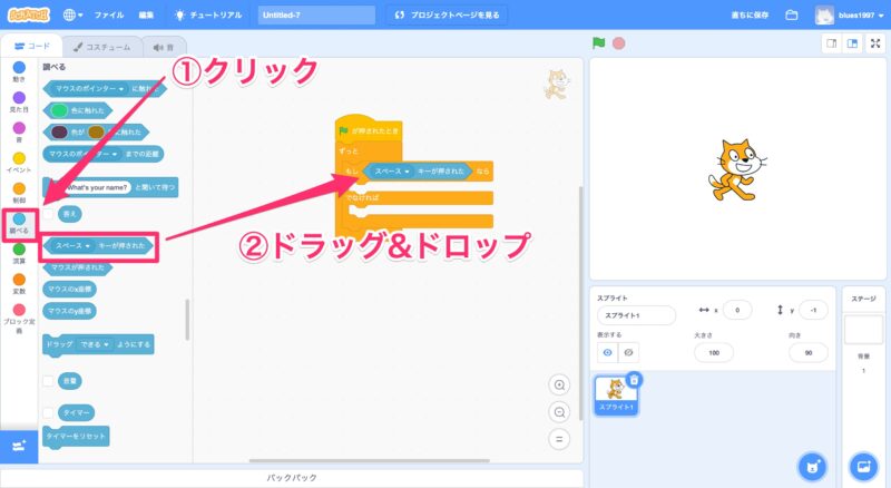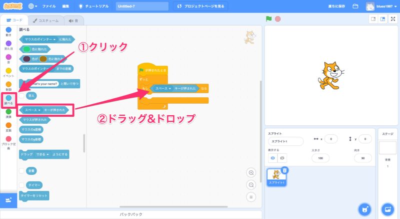 「調べる」をクリックして、「スペースキーが押された」をドラッグ&ドロップしてください。