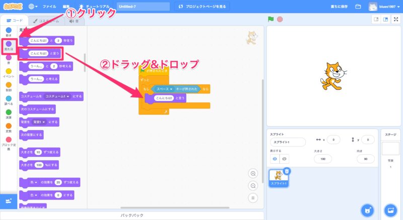 「見た目」をクリックして、「こんにちは!と言う」をドラッグ&ドロップしてください。