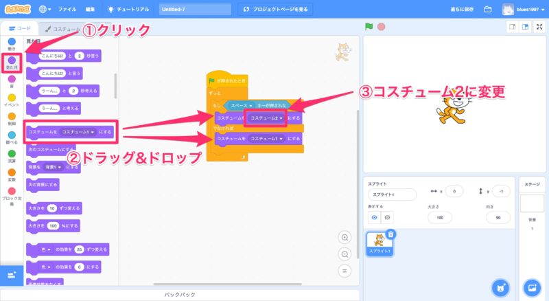 今回の例では、スペースキーを押していないときはコスチューム1、スペースキーを押しているときはコスチューム2になります。